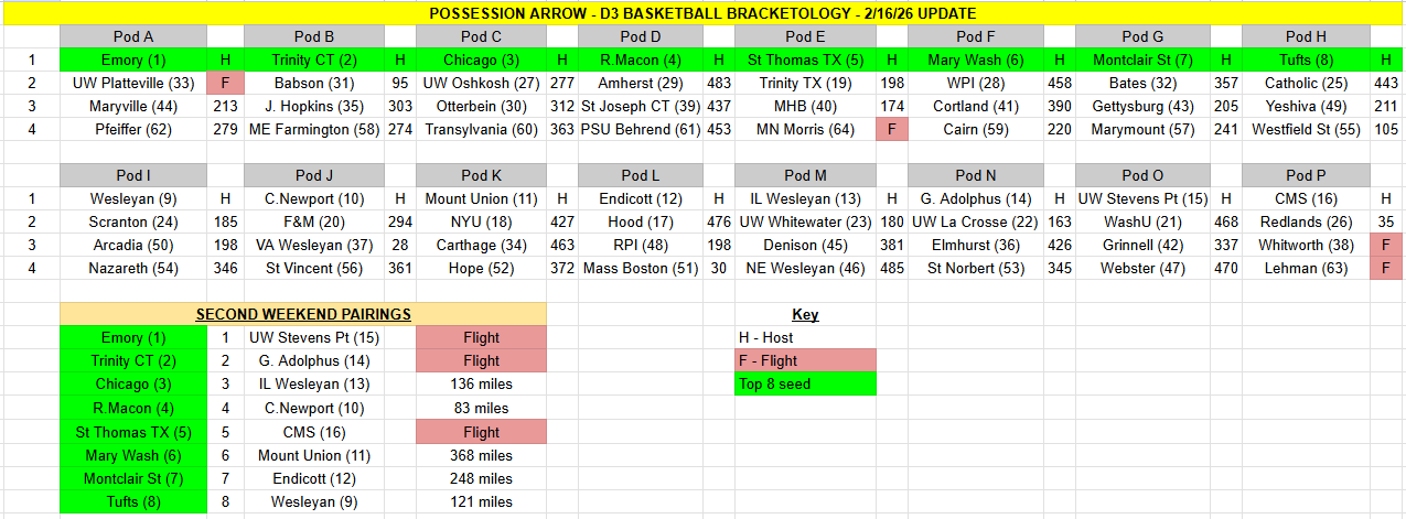 One other thought as it relates to hosting. If this bracket was enacted, I could see WashU (or even Grinnell) getting to host Pod O instead of Stevens Point. With two St Louis teams, there could be a geographic advantage to hosting out of Wisconsin.